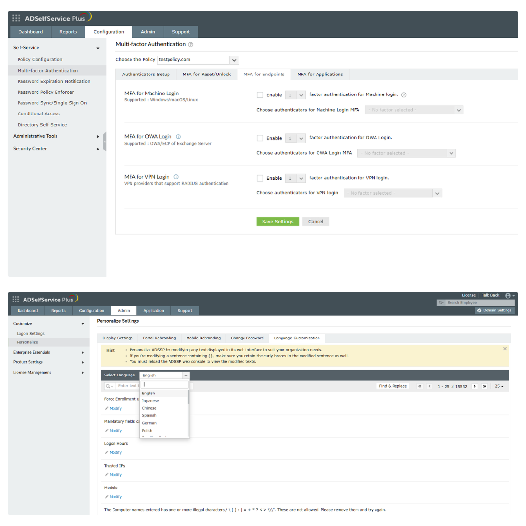 O AD SelfService Plus é uma solução segura e fácil de usar da ManageEngine que permite que os próprios usuários redefinam senhas, desbloqueiem contas e atualizem suas informações no Active Directory – tudo sem precisar acionar o help desk. Com autenticação multifator, alertas de expiração de senha e integração com aplicações em nuvem, o AD SelfService Plus melhora a experiência do usuário final e reduz até 50% da carga do suporte técnico.